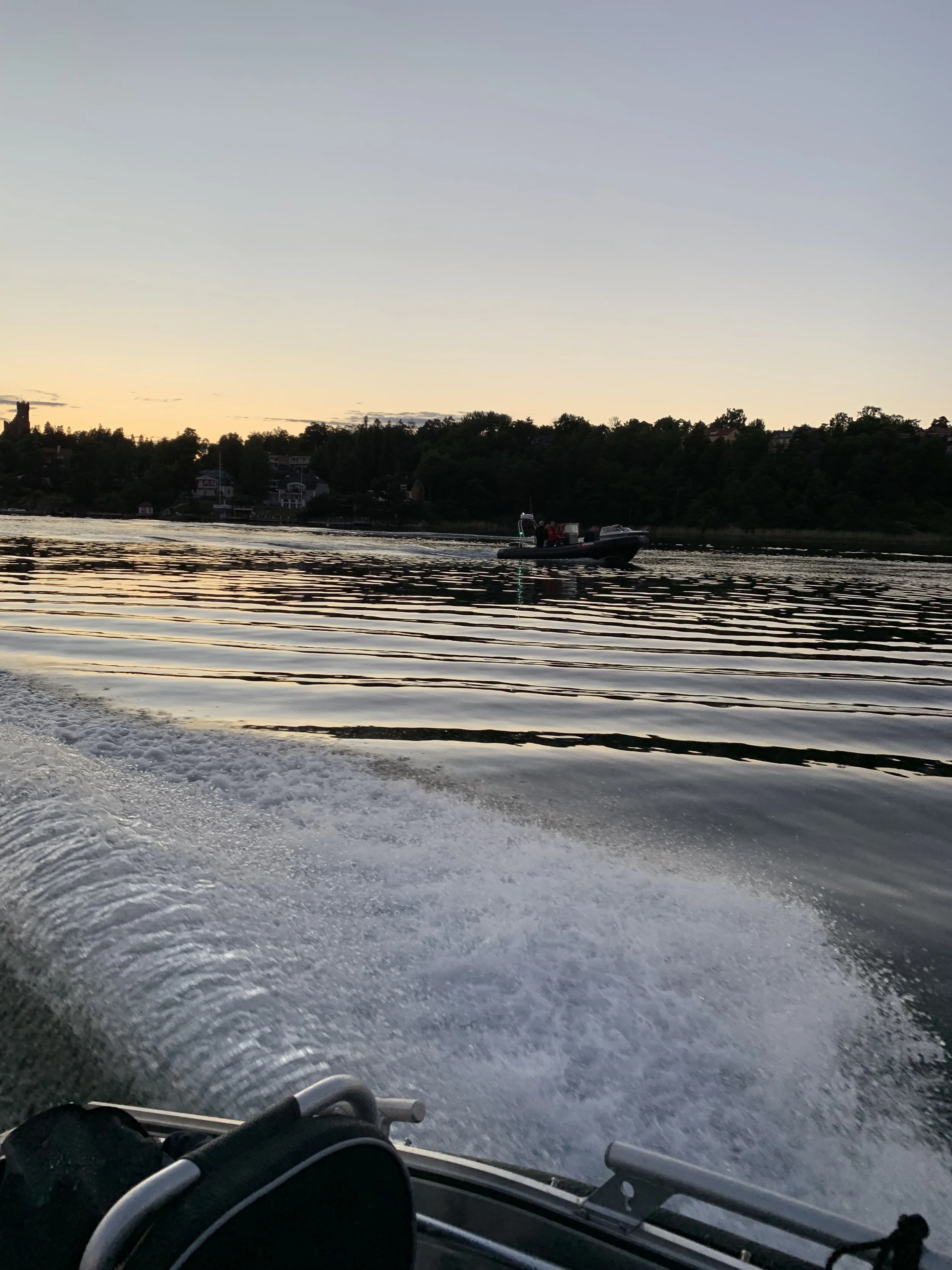 Denna gång gick utflykten med båt från Skeppsbrokajen till Marina Läroverket i Stocksund utanför Stockholm. De riksdagsledamöter som gick förarintygskursen i riksdagshuset tidigare i vår passade också på att göra den praktiska delen av utbildningen denna kväll.